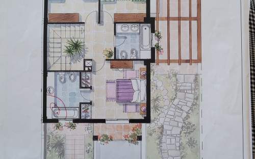 Au premier étage, nous trouvons un grand couloir, 3 chambres et 2 salles de bains avec douche.
